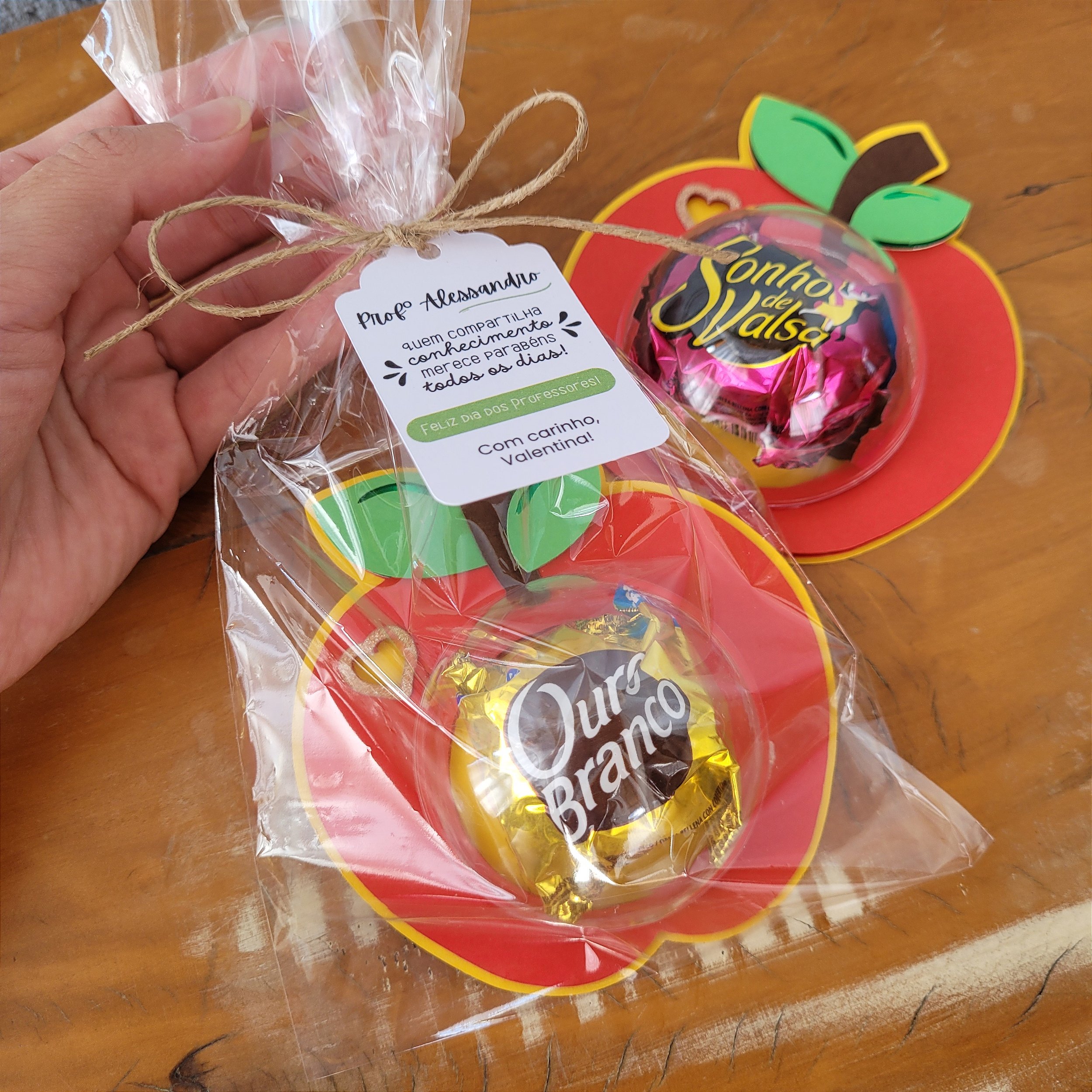 Acompanha embalagem individual em papel transparente e tag com frase e nome personalizado do professor.