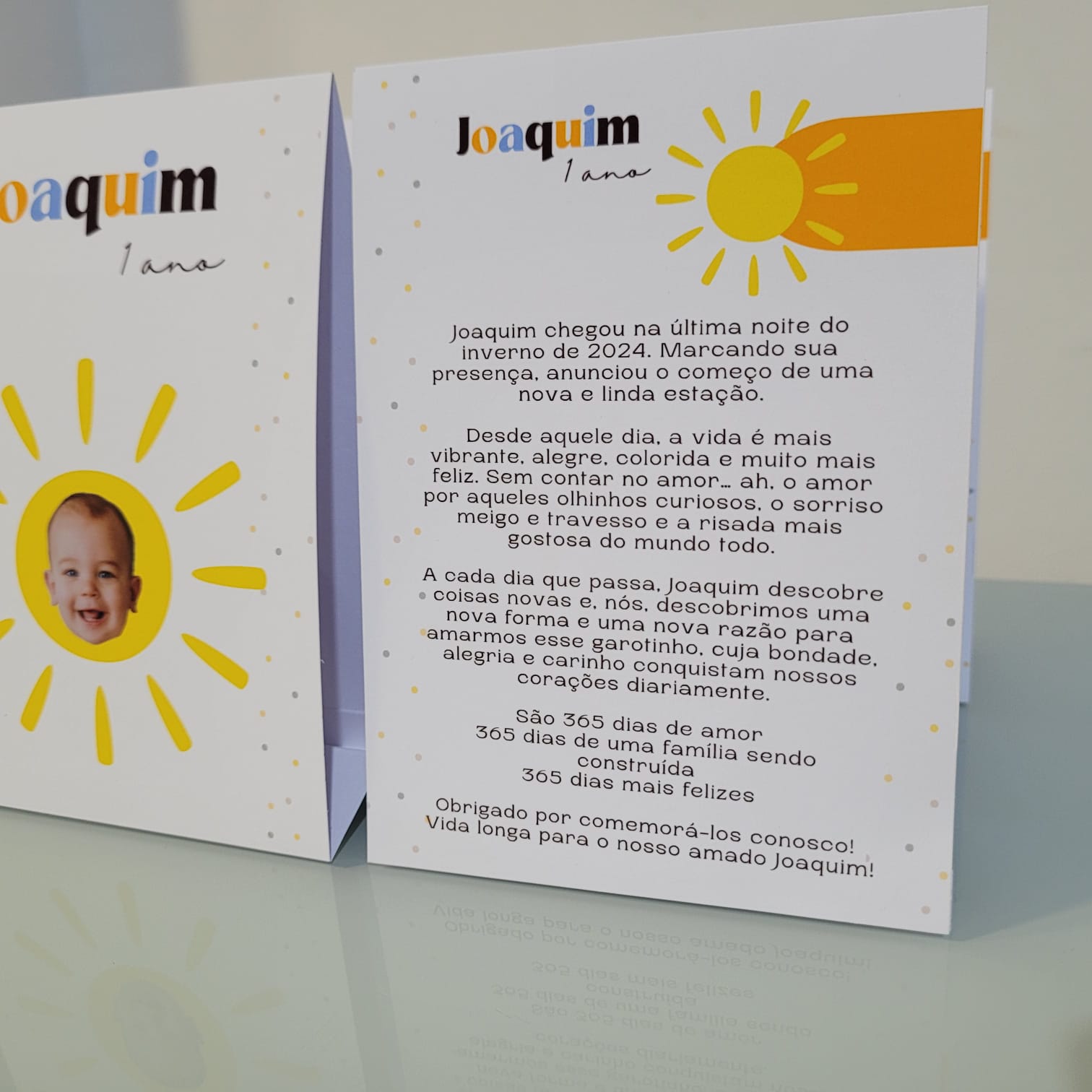 Centro de mesa com arte dos dois lados: um lado no tema da festa, com nome e idade do aniversariante, e do outro lado mensagem de agradecimento pela presença dos convidados.
