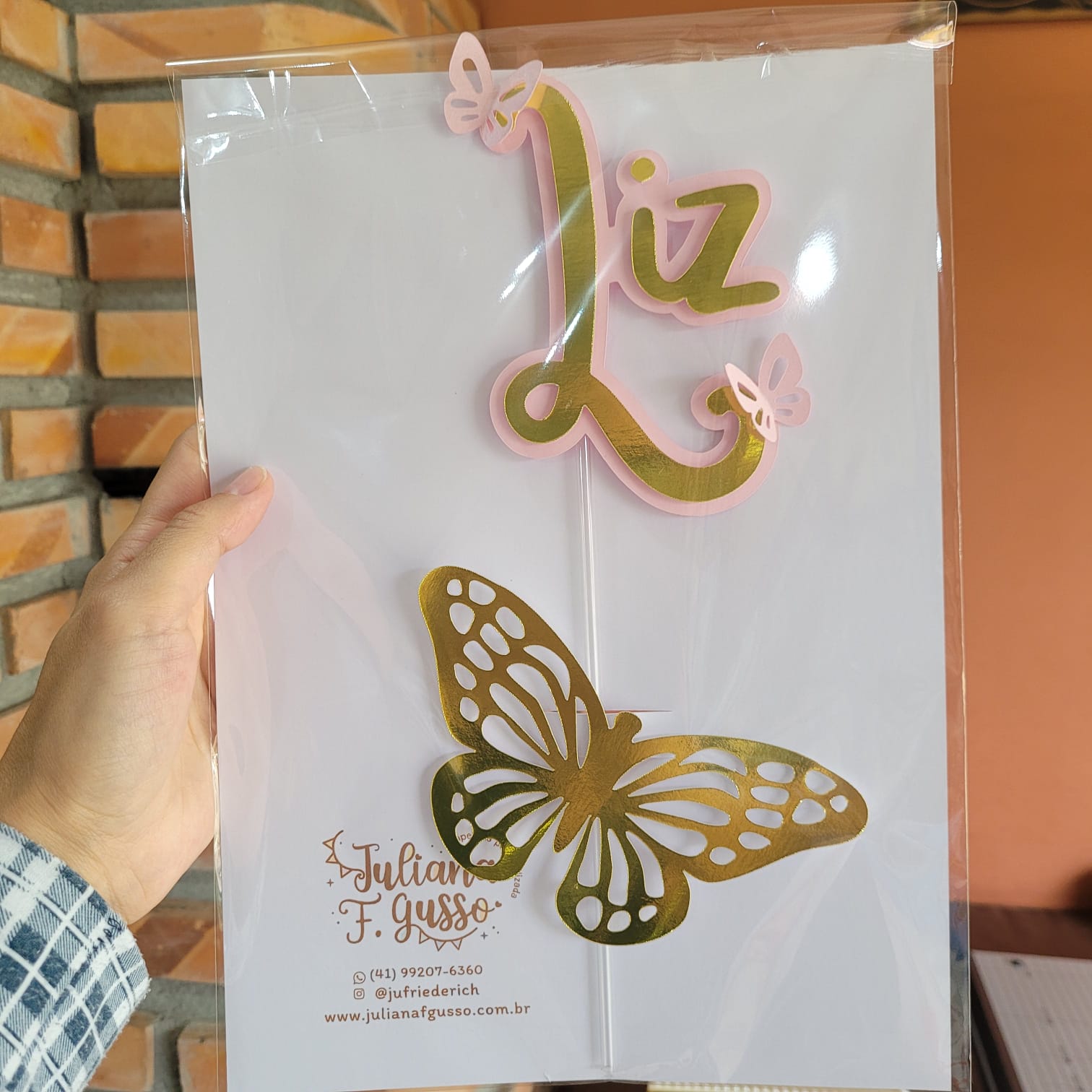 Topo de bolo com nome feito em papel laminado dourado, a segunda camada em papel rosa claro.