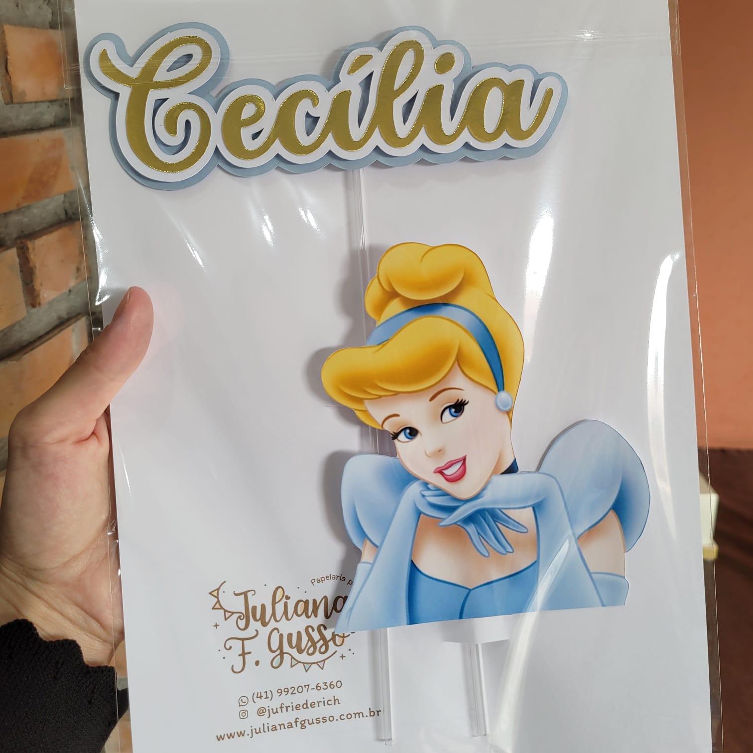 Topo de bolo com nome feito em papel laminado dourado, a segunda camada em papel branco e a terceira em papel azul claro.